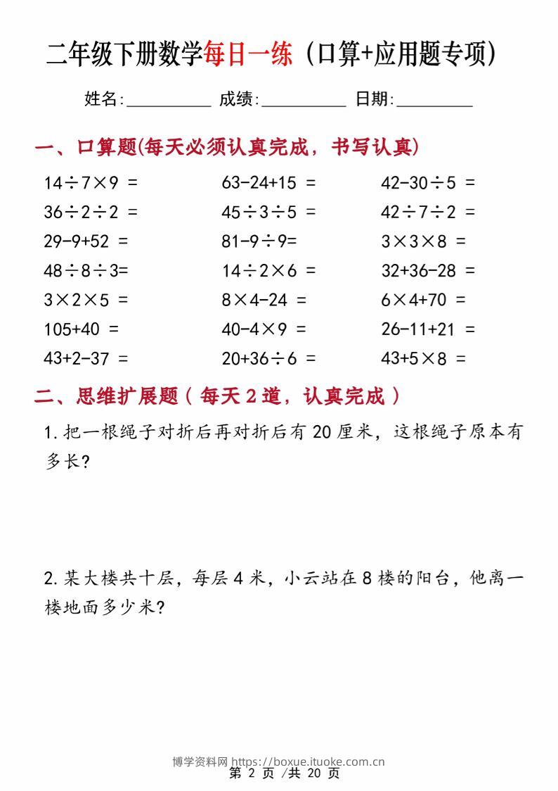 二年级下册数学每日一练(口算+思维应用题20套)20页-高清无水印完整版本博学资料网1年前发布关注私信3511二年级下册数学每日一练(口算+思维应用题20套)20页-高清无水印完整版本此内容为付费资源,请付费后查看¥12.8¥29.9VIP会员免费钻石VIP免费立即购买您当前未登录!建议登陆后购买,可保存购买订单格式pdf页数20 页大小16.88 MB付费资源 ——预览已结束,还剩18页未读——开通会员后可免费下载高清完整文档 © 版权声明文章版权归作者所有,未经允许请勿转载。THE END小学数学 喜欢就支持一下吧点赞11 分享QQ空间微博QQ好友海报分享复制链接收藏