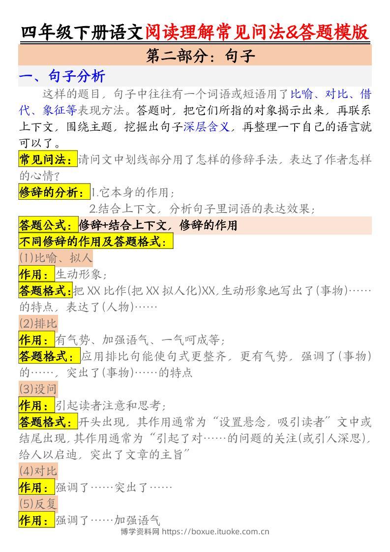 四下语文阅读理解常见问法及答题公式博学资料网9个月前发布关注私信2111四下语文阅读理解常见问法及答题公式此内容为付费资源,请付费后查看¥8.8¥29.9VIP会员免费钻石VIP免费立即购买您当前未登录!建议登陆后购买,可保存购买订单格式pdf页数7 页大小7.46 MB付费资源 ——预览已结束,还剩5页未读——开通会员后可免费下载高清完整文档 © 版权声明文章版权归作者所有,未经允许请勿转载。THE END小学语文 喜欢就支持一下吧点赞11 分享QQ空间微博QQ好友海报分享复制链接收藏
