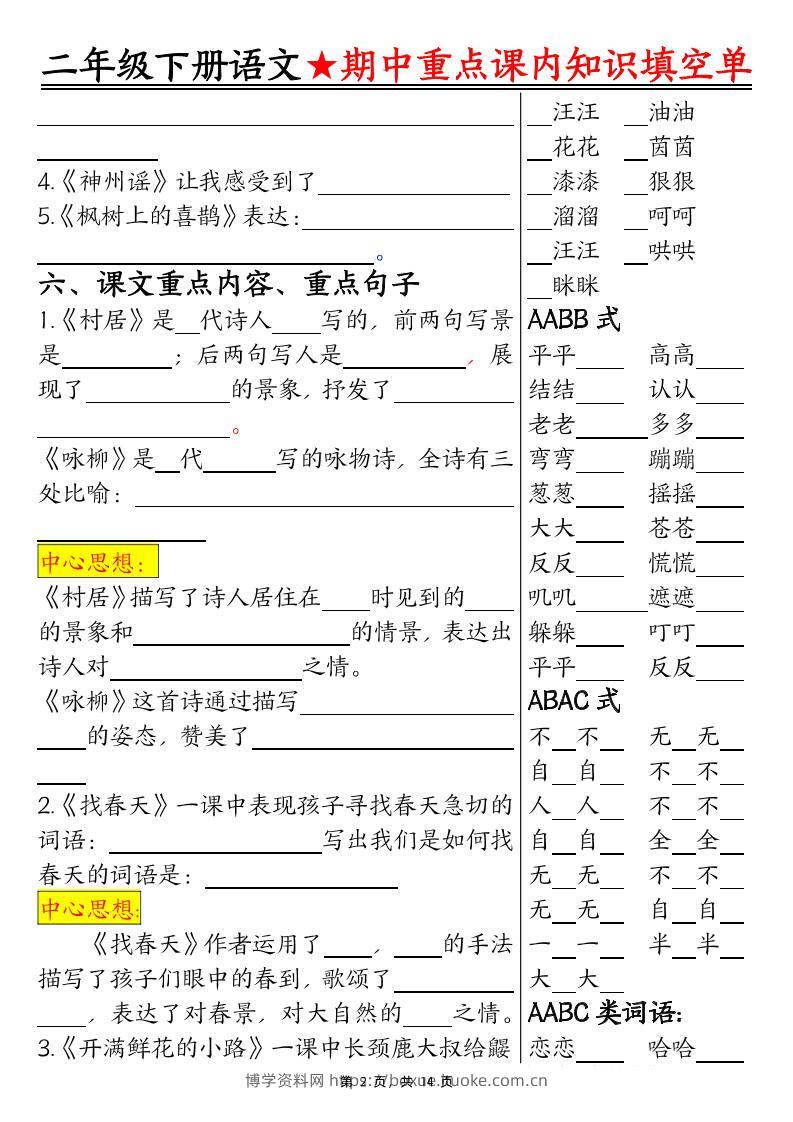 二下语文期中重点课内知识填空单(含答案14页)博学资料网9个月前发布关注私信2613二下语文期中重点课内知识填空单(含答案14页)此内容为付费资源,请付费后查看¥12.8¥29.9VIP会员免费钻石VIP免费立即购买您当前未登录!建议登陆后购买,可保存购买订单格式pdf页数14 页大小9.05 MB付费资源 ——预览已结束,还剩12页未读——开通会员后可免费下载高清完整文档 © 版权声明文章版权归作者所有,未经允许请勿转载。THE END小学语文 喜欢就支持一下吧点赞13 分享QQ空间微博QQ好友海报分享复制链接收藏