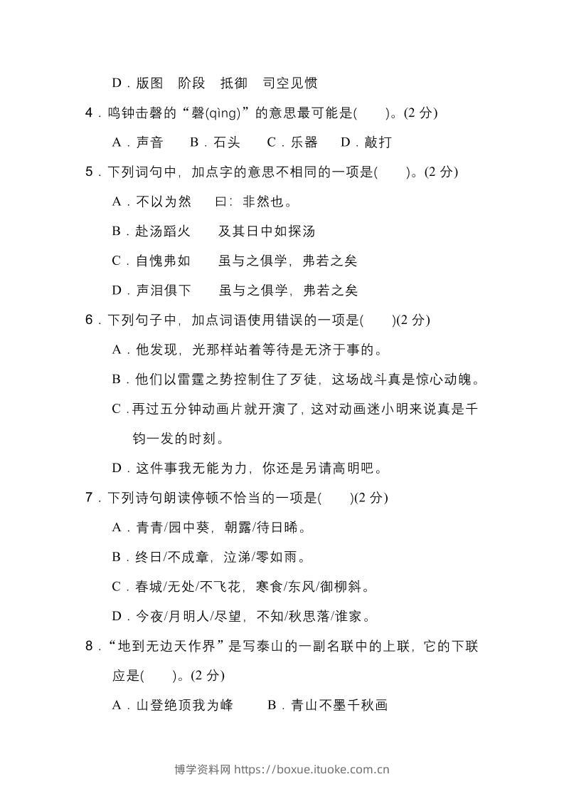 2025年小升初语文重点小学毕业升学全真模拟卷(一)13页博学资料网11个月前发布关注私信49152025年小升初语文重点小学毕业升学全真模拟卷(一)13页此内容为付费资源,请付费后查看¥9.9¥29.9VIP会员免费钻石VIP免费立即购买您当前未登录!建议登陆后购买,可保存购买订单格式pdf页数13 页大小1.03 MB付费资源 ——预览已结束,还剩11页未读——开通会员后可免费下载高清完整文档 © 版权声明文章版权归作者所有,未经允许请勿转载。THE END小升初 喜欢就支持一下吧点赞15 分享QQ空间微博QQ好友海报分享复制链接收藏
