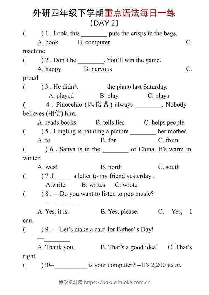 四年级下英语重点语法每日一练《外研版》博学资料网8个月前发布关注私信2411四年级下英语重点语法每日一练《外研版》此内容为付费资源,请付费后查看¥12.8¥29.9VIP会员免费钻石VIP免费立即购买您当前未登录!建议登陆后购买,可保存购买订单格式pdf页数6 页大小202.02 KB付费资源 ——预览已结束,还剩4页未读——开通会员后可免费下载高清完整文档 © 版权声明文章版权归作者所有,未经允许请勿转载。THE END小学英语 喜欢就支持一下吧点赞11 分享QQ空间微博QQ好友海报分享复制链接收藏