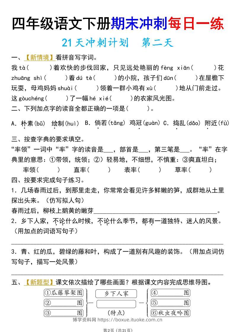 四年级下册语文期末总复习21天冲刺计划(附答案)博学资料网7个月前发布关注私信275四年级下册语文期末总复习21天冲刺计划(附答案)此内容为付费资源,请付费后查看¥6.8¥29.9VIP会员免费钻石VIP免费立即购买您当前未登录!建议登陆后购买,可保存购买订单格式pdf页数28 页大小1.91 MB付费资源 ——预览已结束,还剩26页未读——开通会员后可免费下载高清完整文档 © 版权声明文章版权归作者所有,未经允许请勿转载。THE END小学语文 喜欢就支持一下吧点赞5 分享QQ空间微博QQ好友海报分享复制链接收藏