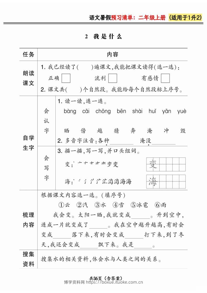 一升二小学语文《暑假预习清单》最新版-二上语文博学资料网6个月前发布关注私信419一升二小学语文《暑假预习清单》最新版-二上语文此内容为付费资源,请付费后查看¥8.8¥29.9VIP会员免费钻石VIP免费立即购买您当前未登录!建议登陆后购买,可保存购买订单格式pdf页数36 页大小6.83 MB付费资源 ——预览已结束,还剩34页未读——开通会员后可免费下载高清完整文档 © 版权声明文章版权归作者所有,未经允许请勿转载。THE END小学语文 喜欢就支持一下吧点赞9 分享QQ空间微博QQ好友海报分享复制链接收藏