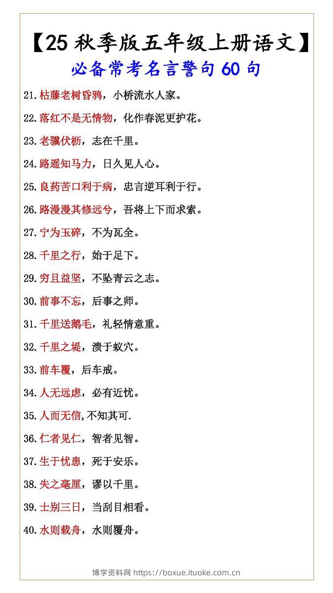 【2025秋新版】【五年级上册语文】必备常考名言警句60句博学资料网8个月前发布关注私信2010【2025秋新版】【五年级上册语文】必备常考名言警句60句此内容为付费资源,请付费后查看¥6.8¥29.9VIP会员免费钻石VIP免费立即购买您当前未登录!建议登陆后购买,可保存购买订单格式pdf页数3 页大小82.97 KB付费资源 ——预览已结束,还剩1页未读——开通会员后可免费下载高清完整文档 © 版权声明文章版权归作者所有,未经允许请勿转载。THE END小学语文 喜欢就支持一下吧点赞10 分享QQ空间微博QQ好友海报分享复制链接收藏