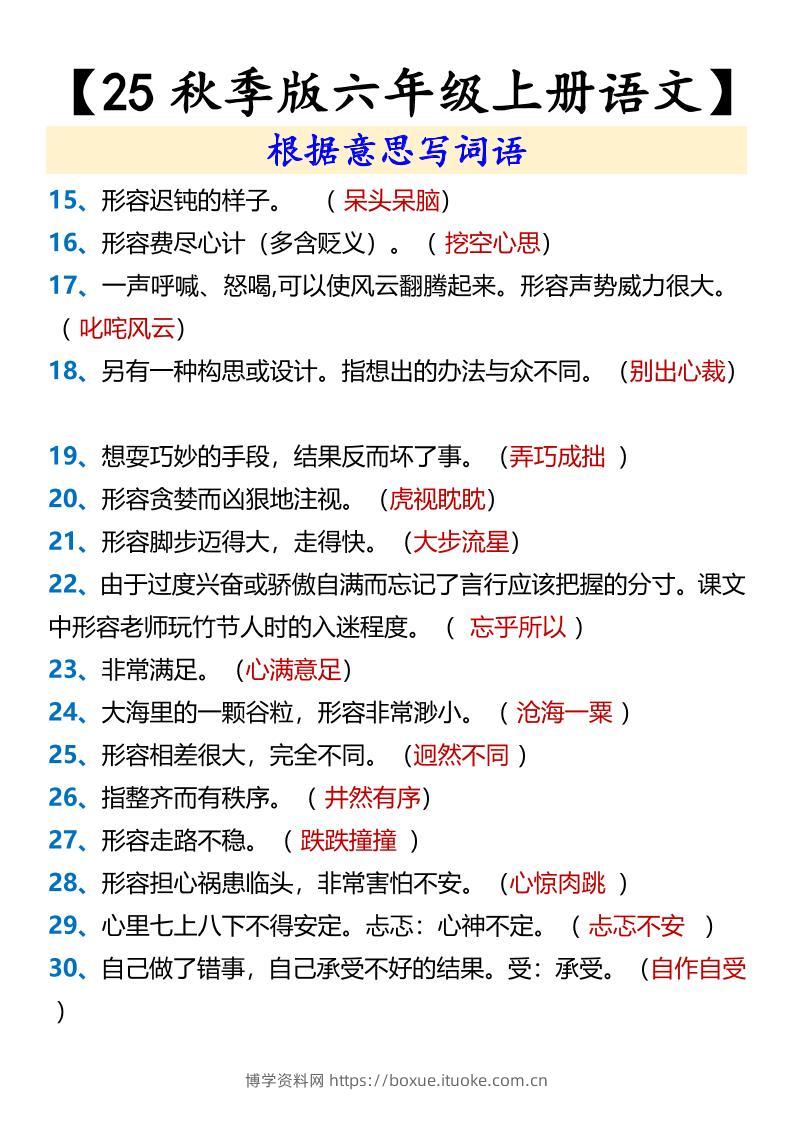 【2025秋新版】【六年级上册语文】根据意思写词语博学资料网8个月前发布关注私信3415【2025秋新版】【六年级上册语文】根据意思写词语此内容为付费资源,请付费后查看¥8.8¥29.9VIP会员免费钻石VIP免费立即购买您当前未登录!建议登陆后购买,可保存购买订单格式pdf页数4 页大小225.20 KB付费资源 ——预览已结束,还剩2页未读——开通会员后可免费下载高清完整文档 © 版权声明文章版权归作者所有,未经允许请勿转载。THE END小学语文 喜欢就支持一下吧点赞15 分享QQ空间微博QQ好友海报分享复制链接收藏