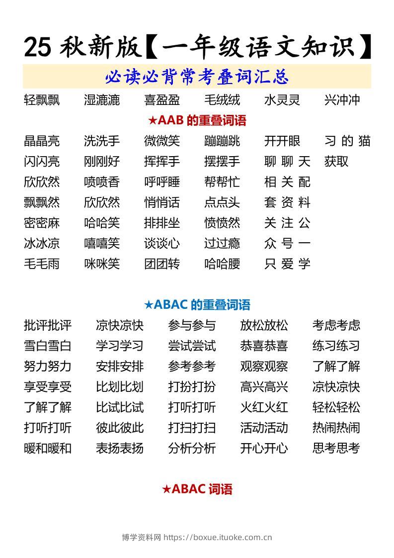 【2025秋新版】【一年级语文知识】必读必背常考叠词汇总-一上语文博学资料网6个月前发布关注私信446【2025秋新版】【一年级语文知识】必读必背常考叠词汇总-一上语文此内容为付费资源,请付费后查看¥12.8¥29.9VIP会员免费钻石VIP免费立即购买您当前未登录!建议登陆后购买,可保存购买订单格式pdf页数3 页大小150.23 KB付费资源 ——预览已结束,还剩1页未读——开通会员后可免费下载高清完整文档 © 版权声明文章版权归作者所有,未经允许请勿转载。THE END小学语文 喜欢就支持一下吧点赞6 分享QQ空间微博QQ好友海报分享复制链接收藏