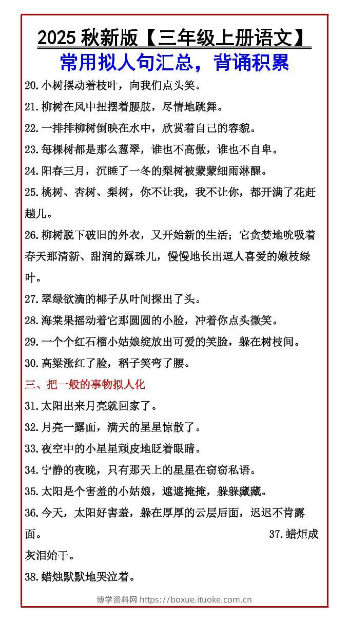 【2025秋新版】【三年级上册语文】常用拟人句汇总,背诵积累博学资料网6个月前发布关注私信328【2025秋新版】【三年级上册语文】常用拟人句汇总,背诵积累此内容为付费资源,请付费后查看¥6.8¥29.9VIP会员免费钻石VIP免费立即购买您当前未登录!建议登陆后购买,可保存购买订单格式pdf页数3 页大小111.93 KB付费资源 ——预览已结束,还剩1页未读——开通会员后可免费下载高清完整文档 © 版权声明文章版权归作者所有,未经允许请勿转载。THE END小学语文 喜欢就支持一下吧点赞8 分享QQ空间微博QQ好友海报分享复制链接收藏