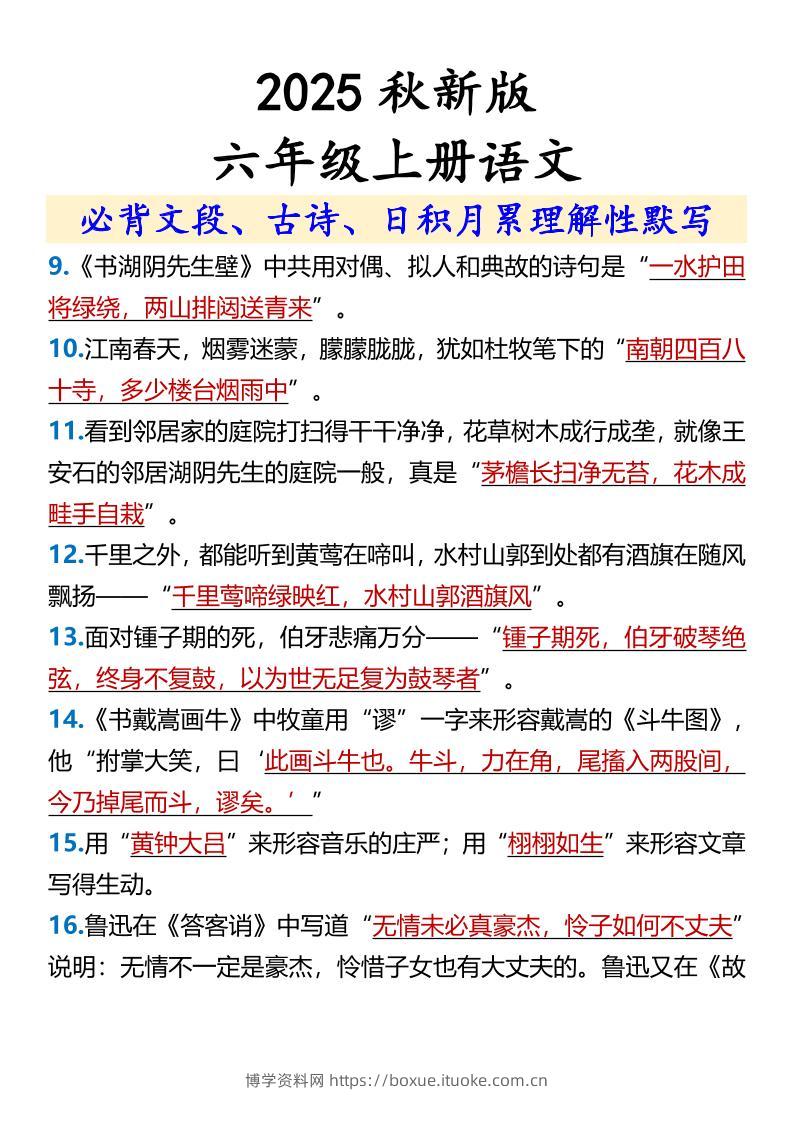 【2025秋新版】【六年级上册语文】必背文段、古诗、日积月累理解性默写博学资料网6个月前发布关注私信3911【2025秋新版】【六年级上册语文】必背文段、古诗、日积月累理解性默写此内容为付费资源,请付费后查看¥9.9¥29.9VIP会员免费钻石VIP免费立即购买您当前未登录!建议登陆后购买,可保存购买订单格式pdf页数4 页大小259.57 KB付费资源 ——预览已结束,还剩2页未读——开通会员后可免费下载高清完整文档 © 版权声明文章版权归作者所有,未经允许请勿转载。THE END小学语文 喜欢就支持一下吧点赞11 分享QQ空间微博QQ好友海报分享复制链接收藏