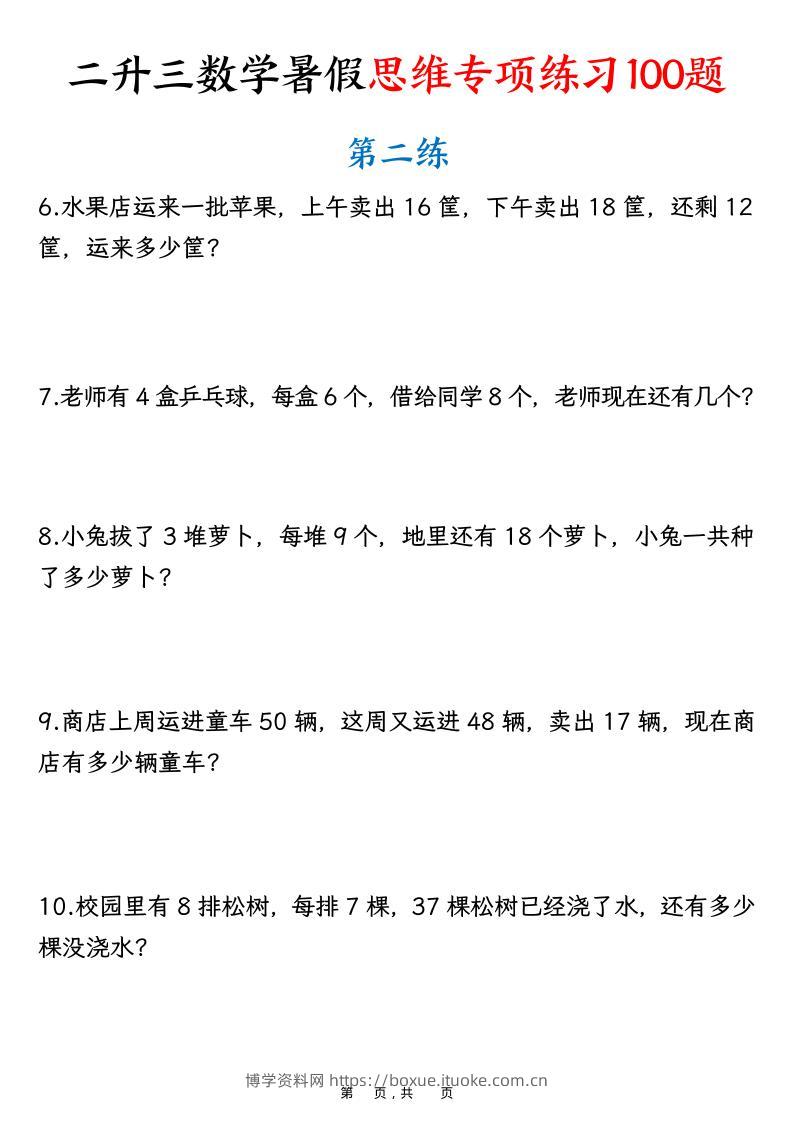 二升三数学暑假思维专项练习100题(含答案26页)-三上数学博学资料网5个月前发布关注私信3810二升三数学暑假思维专项练习100题(含答案26页)-三上数学此内容为付费资源,请付费后查看¥6.8¥29.9VIP会员免费钻石VIP免费立即购买您当前未登录!建议登陆后购买,可保存购买订单格式pdf页数26 页大小273.88 KB付费资源 ——预览已结束,还剩24页未读——开通会员后可免费下载高清完整文档 © 版权声明文章版权归作者所有,未经允许请勿转载。THE END小学数学 喜欢就支持一下吧点赞10 分享QQ空间微博QQ好友海报分享复制链接收藏