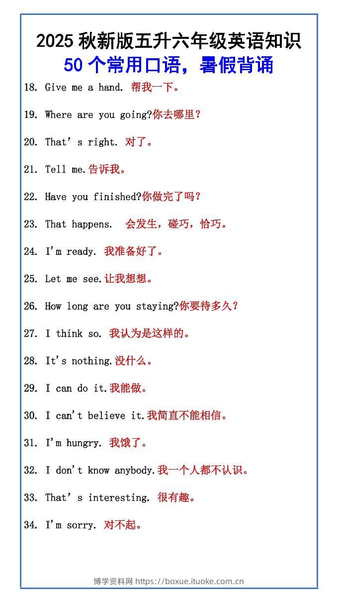 【2025秋新版】五升六年级英语知识50个常用口语,暑假背诵-六上英语博学资料网5个月前发布关注私信2413【2025秋新版】五升六年级英语知识50个常用口语,暑假背诵-六上英语此内容为付费资源,请付费后查看¥9.9¥29.9VIP会员免费钻石VIP免费立即购买您当前未登录!建议登陆后购买,可保存购买订单格式pdf页数4 页大小60.78 KB付费资源 ——预览已结束,还剩2页未读——开通会员后可免费下载高清完整文档 © 版权声明文章版权归作者所有,未经允许请勿转载。THE END小学英语 喜欢就支持一下吧点赞13 分享QQ空间微博QQ好友海报分享复制链接收藏