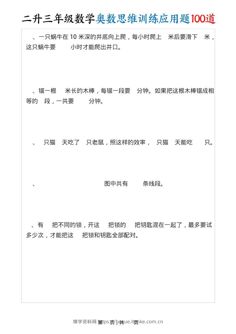 二升三年级数学奥数思维训练应用题100道(含答案35页)-三上数学博学资料网5个月前发布关注私信509二升三年级数学奥数思维训练应用题100道(含答案35页)-三上数学此内容为付费资源,请付费后查看¥9.9¥29.9VIP会员免费钻石VIP免费立即购买您当前未登录!建议登陆后购买,可保存购买订单格式pdf页数35 页大小347.62 KB付费资源 ——预览已结束,还剩33页未读——开通会员后可免费下载高清完整文档 © 版权声明文章版权归作者所有,未经允许请勿转载。THE END小学数学 喜欢就支持一下吧点赞9 分享QQ空间微博QQ好友海报分享复制链接收藏